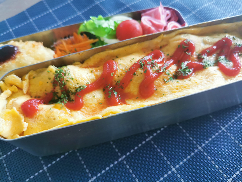 オムライスは、卵焼き用フライパンで四角く焼いた薄焼き卵を容器の幅に合わせて切って乗せただけ。